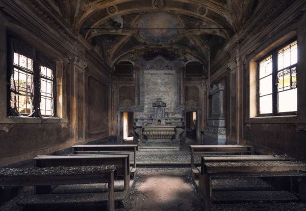 De kleine kapel van een enorm palazzo in het noorden van Italië. Alleen de talrijke duiven aanbidden hier nog.