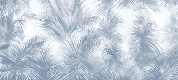 Elegante palmblaadjes in diverse blauwtinten, variërend van zacht pastelblauw tot diep marineblauw. Zo ontstaat een kalme, bijna kustachtige sfeer met een tropisch randje.