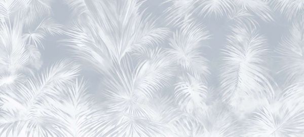 Luchtige palmblaadjes in zachte blauwtinten en lichte pastels, die de frisheid van een heldere hemel weerspiegelen. Deze subtiele kleuren brengen een gevoel van ruimte en onbezorgdheid in elke kamer.
