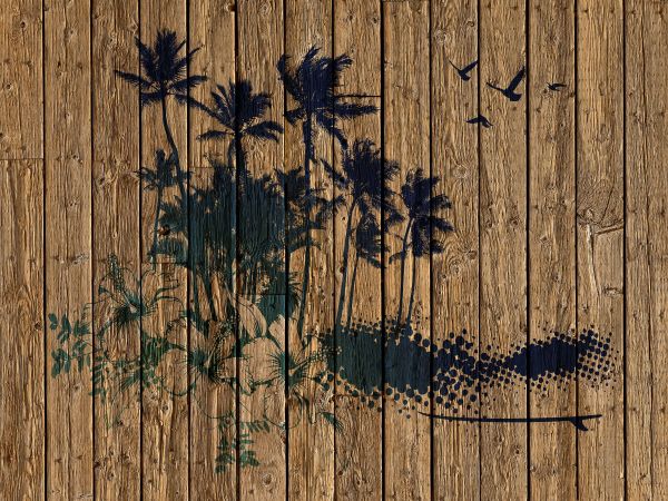 Zomers beeld met palmbomen, zee, bloemen, vogels en een surfplank op hout. Met dit fotobehang creëer je een unieke sfeer in huis.