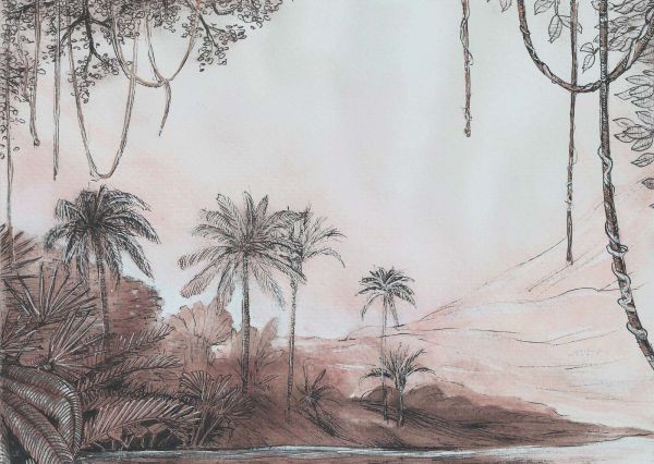 Dit ontwerp vangt een tropisch landschap op een bijna dromerige manier. De illustratie is opgebouwd uit fijn getekende lijnen in een inktstijl, gecombineerd met zachte aquarelverf in tinten van oudroze, terracotta en lichtbruine nuances. Palmbomen rijzen elegant op uit het landschap, omringd door golvende heuvels en weelderige beplanting. Bovenin hangen lange lianen en bladeren die het beeld omlijsten als een natuurlijk kader. Het geheel heeft een zachte lichtval, waardoor het lijkt alsof de scène baadt in een warme avondschemering.