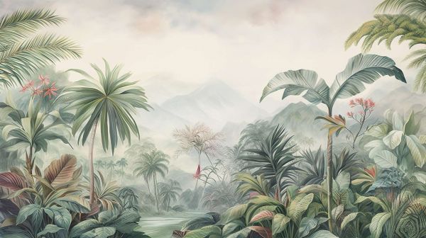 Een uitgestrekt tropisch landschap baadt in zachte pastelkleuren, waarbij elke plant en bloem met zorg is geplaatst om een harmonieus geheel te vormen. De bergen op de achtergrond bieden een gevoel van majesteit en schaal, terwijl de bloeiende flora een subtiele hint van kleur en leven toevoegt.