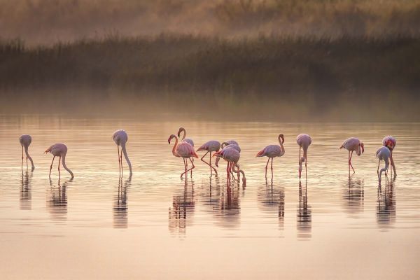 Flamingo's in een meer. Boven het meer hangt nog wat mist.