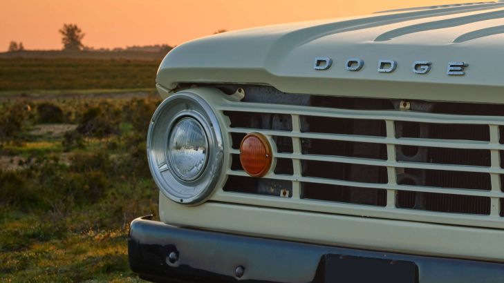 Stoere Dodge pick-up bij zonsopgang, vroeg in de ochtend gefotografeerd op de heide