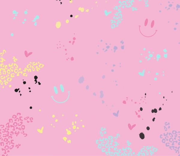 Roze print met een splash van verfspetters, panter print, hartjes en een kleine glimlach.