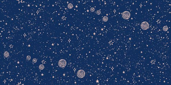 Kosmische Dans is een sprankelend patroon waarin sterren en sierlijk getekende planeten harmonieus door de ruimte lijken te bewegen. De nachtblauwe achtergrond zorgt voor diepte en rust, terwijl de zachtroze elementen voor een subtiele, dromerige uitstraling zorgen. De wervelende lijnen in de planeten geven het geheel een handgetekende en speelse twist, perfect voor wie houdt van een magische, ruimtelijke sfeer.