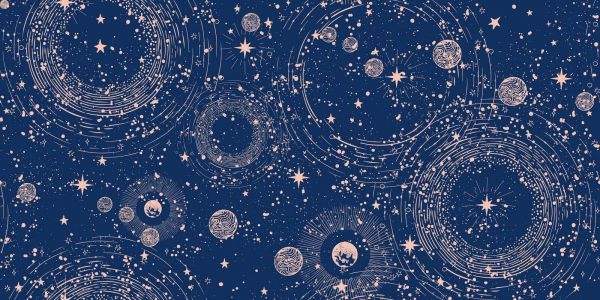 Een mystiek schouwspel van sterren, planeten en kosmische cirkels op een diepe nachtblauwe achtergrond, met zachtroze lijnen die een dromerige, galactische sfeer oproepen.