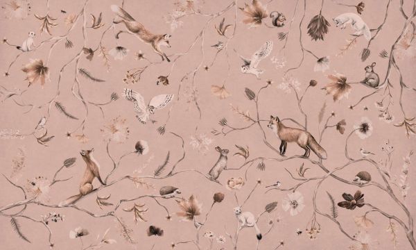 Dit tedere ontwerp brengt het bos tot leven op een poederroze ondergrond die zacht en warm aanvoelt. Tussen sierlijke takken en verfijnde bloemen bewegen bosdieren zoals vossen, wezels, egels, uilen, konijnen en eekhoorns zich rustig voort. Alles is met de hand geïllustreerd in elegante aardetinten zoals bruin, crème, karamel en zand – subtiel afgezet tegen het roze, wat het geheel een dromerige, bijna sprookjesachtige sfeer geeft. De bloemen en bladeren zijn verspreid in een rustig ritme, met fijne details die uitnodigen tot kijken zonder te overheersen. Het kleurenpalet is perfect in balans: warm, natuurlijk en harmonieus, waardoor het ontwerp vriendelijk oogt en tegelijkertijd stijlvol blijft.