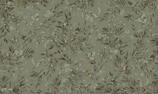 Roodborstjes en vlinders fladderen tussen wilde bloemen en bladeren op een zachte olijfgroene achtergrond. De natuurlijke bruin-, crème- en grijsgroene tinten zorgen voor een kalme en elegante uitstraling.