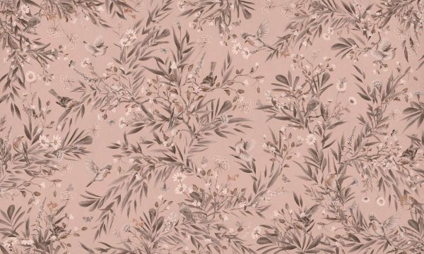 Tedere vogeltjes fladderen tussen bloemen en takken op een warme oudroze achtergrond. De zachte aardetinten geven dit patroon een dromerige, klassieke en romantische uitstraling met natuurlijke elegantie.