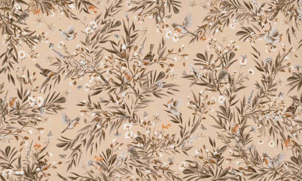 Roodborstjes, vlinders en bloemen komen tot leven op een warme zandkleurige achtergrond. Een rustig patroon met natuurlijke tinten, dat warmte, elegantie en een vleugje zomer in elke ruimte brengt.