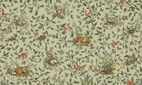 Dit charmante ontwerp brengt een magisch boslandschap tot leven, waar konijntjes, eekhoorns, uilen en zangvogels zich schuilhouden tussen weelderige eikentakken en zachte bloemen. De achtergrond is een kalme groengrijze tint, die de warme kleuren van de dieren en de diepgroene bladeren prachtig laat uitkomen. Overal in het patroon ontdek je kleine verhaaltjes: een slapend konijn op een bedje van mos, een uil op een tak vol bloesem, een nestje jonge vogels, en speelse eekhoorns die vrolijk klauteren tussen eikels en vlinders.