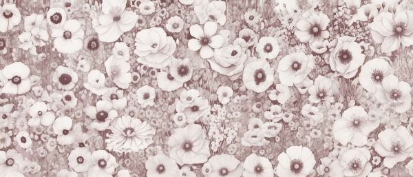 Een luxueuze twist op het monochrome bloemenveld, met subtiele wijntinten die de papavers en wilde bloemen omhullen in een warme, elegante gloed. De mix van diepe roodachtige schakeringen en zachte grijstinten voegt een vleugje drama toe.