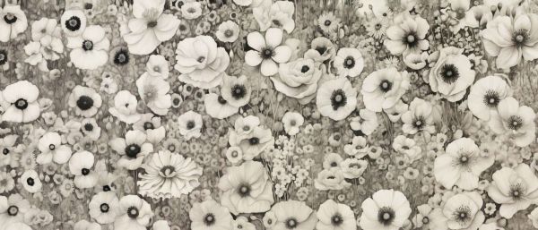 Een prachtig monochroom bloemenveld met gedetailleerde papavers en wilde bloemen in zachte zwart-wittinten. De subtiele contrasten en fijne schaduwen geven het ontwerp een klassieke, tijdloze uitstraling. De delicate, bijna illustratieve stijl brengt een serene en verfijnde sfeer in elke ruimte.