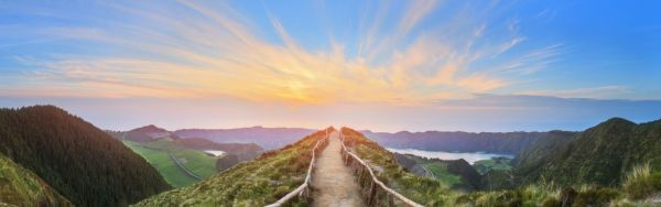 Fotobehang met een panoramafoto van een prachtige wandel route in een berggebied in Portugal met uitzicht over verschillende meren.