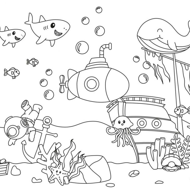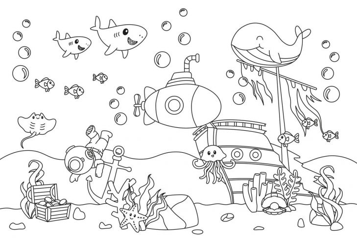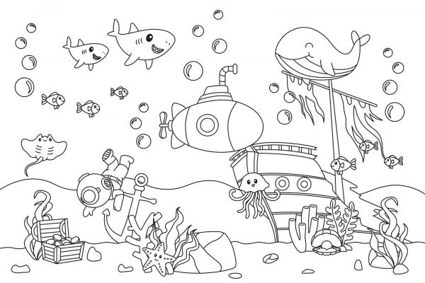 Dit vrolijke en fantasierijke ontwerp neemt je mee op avontuur in de diepte van de oceaan. Centraal zien we een klassieke duiker die tussen ankers, planten en een open schatkist zweeft. Hij wordt vergezeld door een bont gezelschap van vriendelijke zeedieren, waaronder een glimlachende walvis, een nieuwsgierige kwal, een zwerm vissen, drie speelse haaien en zelfs een elegante rog. Een stoere onderzeeër en een oud piratenschip brengen extra verhaal en spanning in het beeld.