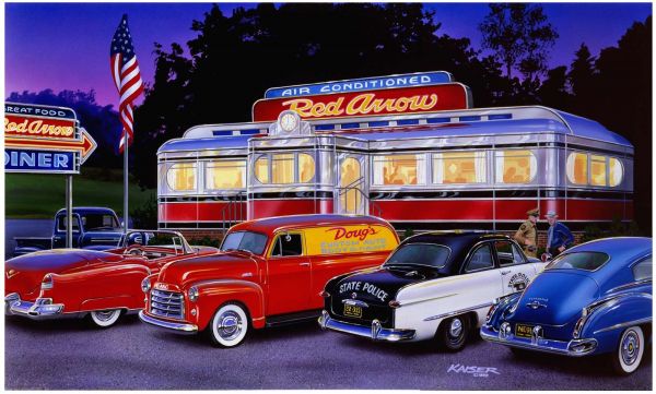 Deze afbeelding brengt je naar een nostalgische avond bij de klassieke "Red Arrow Diner", waar retro charme en vintage stijl samenkomen.