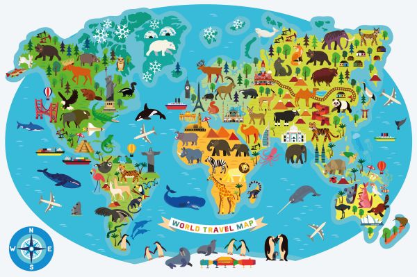 Een tekening van een wereldkaart met dieren en objecten en in verschillende kleuren.