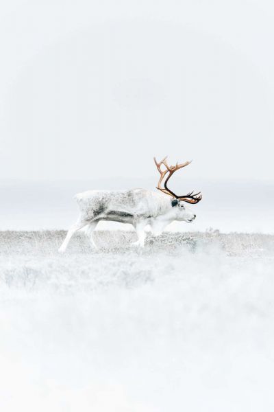 Deze minimalistische, bijna etherische compositie toont een rendier in een winterse toendra. Het dier – witgrijs van kleur met een opvallend bruin gewei – beweegt rustig voort door een ijzige, met rijp bedekte vlakte. De achtergrond en voorgrond zijn volledig verzadigd in bleke tinten: wit, zachtgrijs en ijzig blauw. Door het hoge contrast tussen het helderwitte landschap en de donkere lijnen van het gewei ontstaat een indrukwekkende visuele balans die rust en kracht tegelijk uitstraalt. Het beeld heeft een bijna droomachtige, stille kwaliteit, alsof het bevroren is in de tijd.