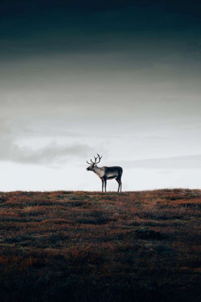 Een solitair rendier staat krachtig in een uitgestrekt, bruinoranje heidelandschap onder een bewolkte hemel. De compositie ademt rust, openheid en natuurlijke grootsheid, met een contrastrijk spel tussen het warme aardoppervlak en de koele, bleke lucht.