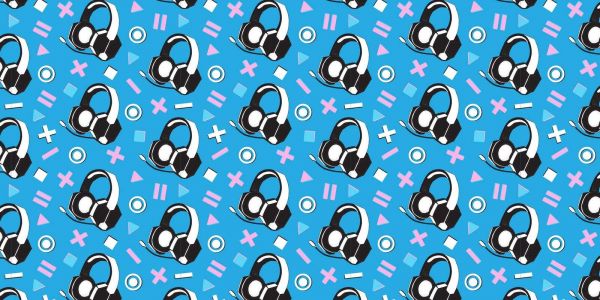 Een speels en modern gamingontwerp met herhalende patronen van gamingheadsets en geometrische symbolen op een levendige blauwe achtergrond. De combinatie van zwart-witte headsets met roze en witte game-iconen geeft het design een retro en dynamische uitstraling, perfect voor een trendy gamekamer.
