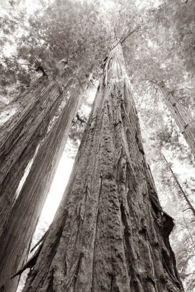 Een krachtig beeld van indrukwekkende boomreuzen, vastgelegd vanuit laag perspectief in zachte sepia- en grijstinten. De verticale lijnen en texturen geven een gevoel van hoogte, stilte en tijdloosheid.