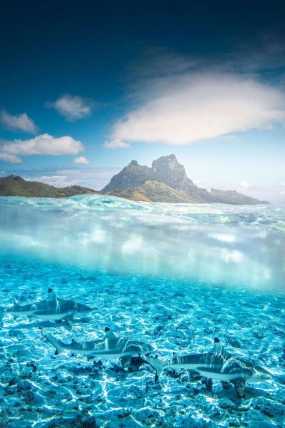 Dit spectaculaire beeld combineert het beste van twee werelden: boven water een tropisch eiland met groene heuvels en een markante bergtop onder een diepblauwe lucht met wolkensluiers; onder water een levendige en serene onderzeewereld waarin rifhaaien gracieus over de witte zandbodem glijden. Het water is kraakhelder en speelt met het licht, waardoor de haaien omgeven worden door schitterende reflecties en schaduwpatronen.