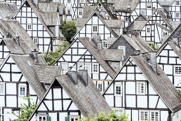 Dit opvallende ontwerp toont een fascinerend raster van traditionele vakwerkhuizen, zoals je die vindt in historische dorpen in Duitsland of de Ardennen. De gevels bestaan uit een strak patroon van zwarte houten balken en witte pleister, afgewisseld met leistenen daken in grijstinten. Het beeld lijkt bijna abstract door de herhaling van puntige daklijnen, vierkante raampjes en diagonale elementen, terwijl het toch warmte en erfgoed uitstraalt.