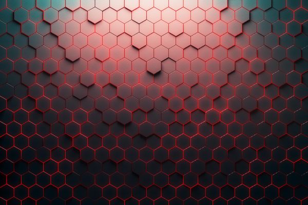 Dit opvallende ontwerp combineert rode en zwarte hexagonale patronen, die samen een levendige en moderne sfeer creëren. De zeshoekige vormen zijn zorgvuldig gerangschikt en overlappen elkaar subtiel, wat een gevoel van diepte en dimensie aan het geheel toevoegt. Het gebruik van schaduw en lichtaccenten zorgt voor een dynamisch visueel effect dat voortdurend in beweging lijkt te zijn.