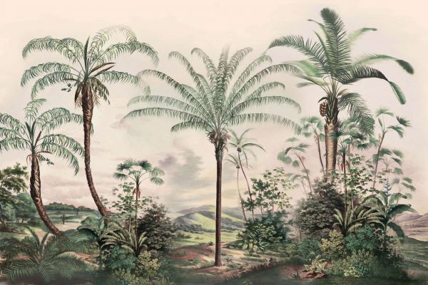 Een sfeervol tropisch landschap met hoge, sierlijke palmbomen en weelderige begroeiing. De zachte pasteltinten en subtiele penseelstreken geven het geheel een vintage en artistieke uitstraling. Op de achtergrond zorgen glooiende heuvels en een lichte, bewolkte lucht voor een rustige en dromerige sfeer.