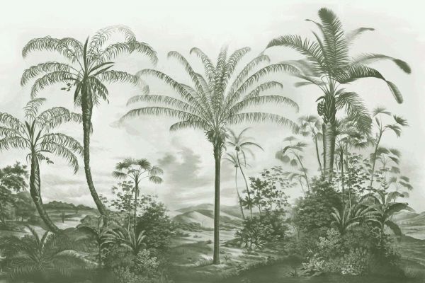 Een levendig tropisch landschap met heldere groentinten en weelderige palmbomen, afgewisseld met zachte pastelkleuren in de achtergrond. Dit ontwerp ademt frisse energie en brengt een vrolijke, exotische sfeer.