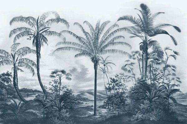 Dit ontwerp verenigt de rust van de oceaan met de weelderigheid van een tropisch landschap. De palmbomen contrasteren op een speelse manier met de blauwtinten in de lucht en de verte, waardoor een fris en ontspannen tafereel ontstaat dat doet denken aan zonovergoten kusten.