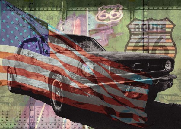 De combinatie van een krachtige auto, de Amerikaanse vlag en de Route 66-symboliek maakt dit werk een visuele ode aan vrijheid en ontdekking. Het spreekt tot de verbeelding en nodigt uit om weg te dromen naar lange reizen over eindeloze wegen.