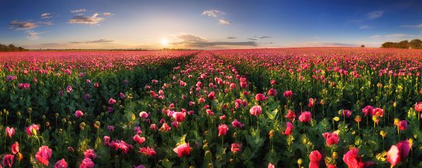 Een panorama foto genomen van een landschap vol met prachtige, paarse klaprozen met in de verte nog de zon.