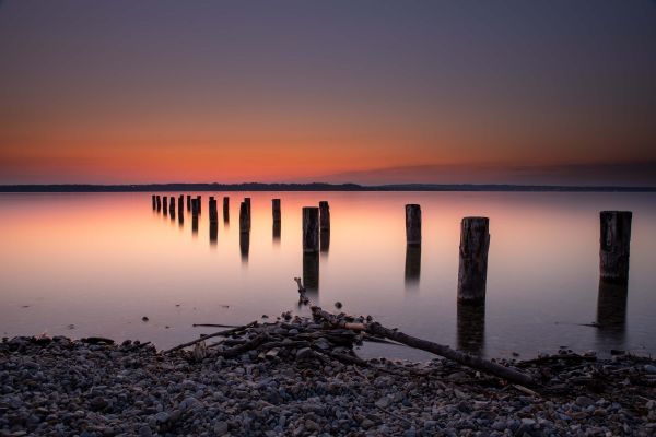 Een adembenemende afbeelding van een roze rustige strand met paalhoofden.