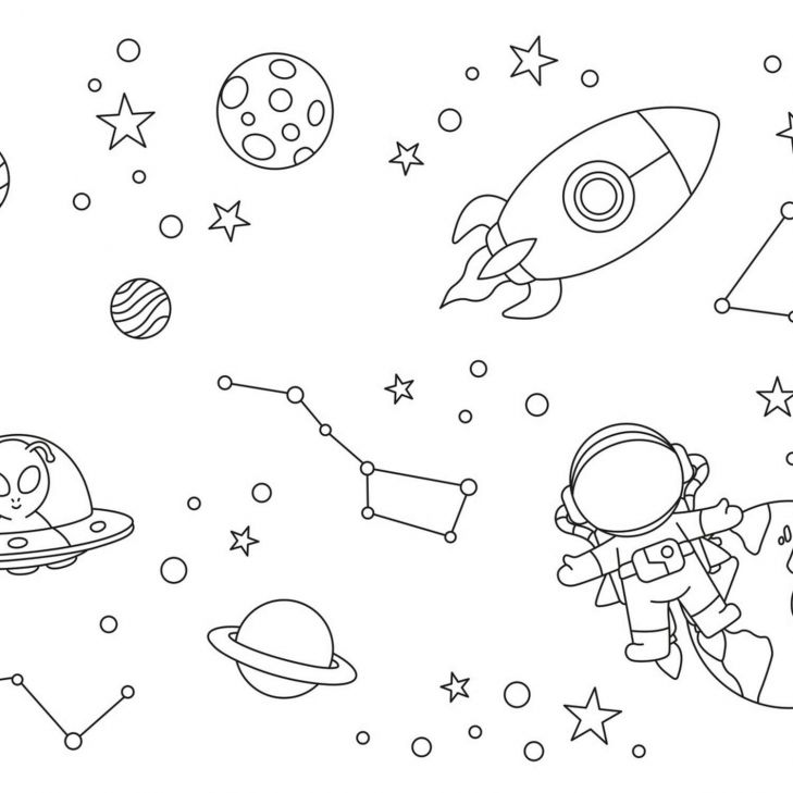 Alles is weergegeven in heldere, zwarte lijnen op een lichte achtergrond, waardoor het geheel overzichtelijk blijft en ruimte laat voor fantasie of zelfs inkleuring. De verschillende elementen – zoals de maan, Saturnus, het ruimtepak en de UFO – geven het geheel een speelse mix van educatie en verbeelding.