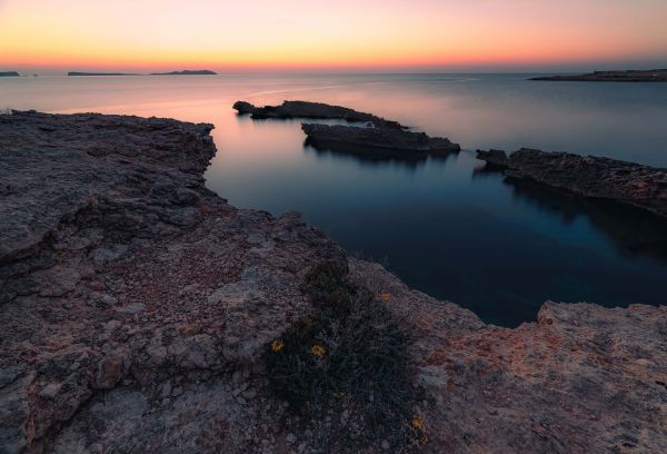 Een mooie foto van een zonsondergang met rotsen en rustig water.