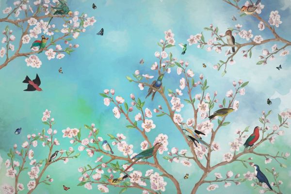 Dit ontwerp vangt de essentie van een lenteochtend met bloeiende kersenbloesems, charmante vogels en sierlijke vlinders die samen een levendige scène vormen. De zachte blauwe lucht met subtiele wolken benadrukt de frisse, natuurlijke sfeer en straalt rust en vitaliteit uit.