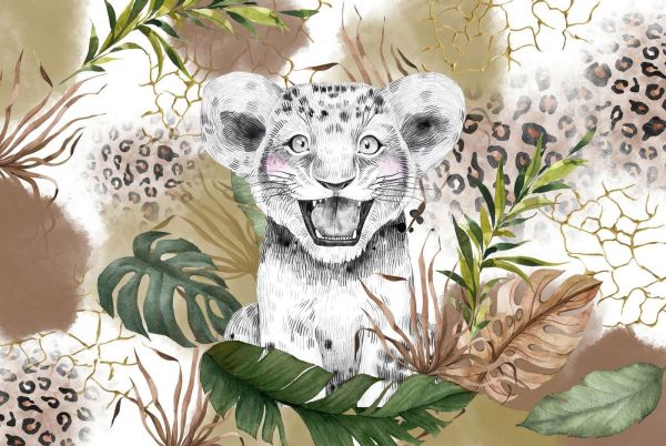 Prachtig behang met een babyleeuw op een decor van bruin en groen getint gebladerte.