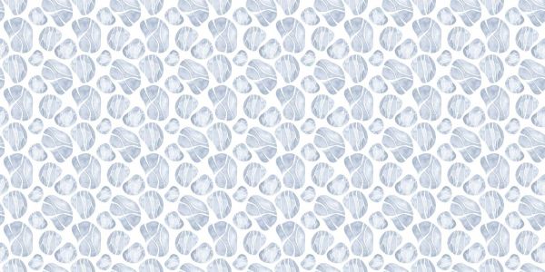 Een serene verzameling van schelpen, afgebeeld in rustgevende blauwtinten, creëert een sfeer van kalmte en rust. De herhaling en plaatsing van de schelpen roepen het ritme van golven op, die zachtjes over de oceaanbodem rollen.