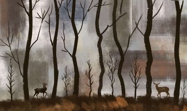 In een wereld van abstracte vormen en zachte kleurovergangen staat een hert rustig tussen de naakte bomen. De diffuse achtergrond suggereert een mistige ochtend of een stille avondschemer, waarin de natuurlijke wereld tot rust komt en de dag begroet of afsluit.
