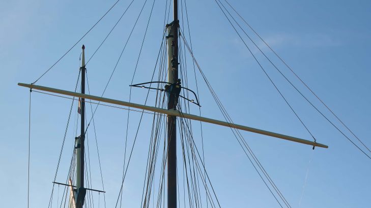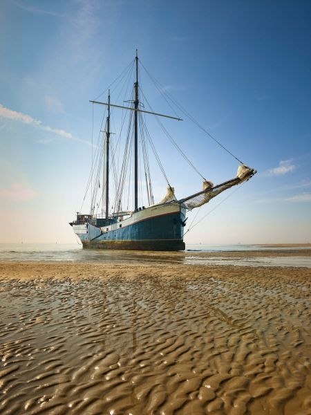 Schip op het wad met mooie ribbels in het zand op de voorgrond