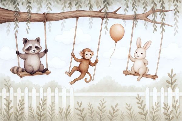In dit lieflijke beeld zweven drie dierenvriendjes rustig heen en weer op houten schommels, opgehangen aan een stevige tak vol hangend groen. Een ondeugend aapje, een nieuwsgierig wasbeertje en een kalm konijntje genieten zichtbaar van het moment. Tussen hen in zweeft een oranje ballon zacht omhoog, terwijl wolkjes voorbijdrijven tegen een lichtblauwe lucht. Een wit tuinhekje en sierlijke planten maken de rustige, tuinachtige sfeer compleet.
