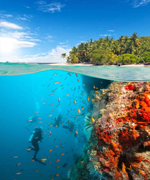 Een groep scubaduikers bij een tropisch eiland. Boven het water is het eiland te zien.