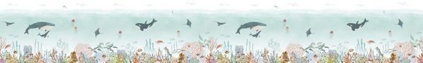 Het kleurgebruik is zacht en harmonieus, met een rustige lichtblauwe achtergrond die de illusie van helder zeewater oproept. De subtiele kleuraccenten en het speelse lijnenspel maken het geheel luchtig en vriendelijk. Dit ontwerp is ideaal voor kinderkamers of babykamers waarin rust en verwondering samenkomen.