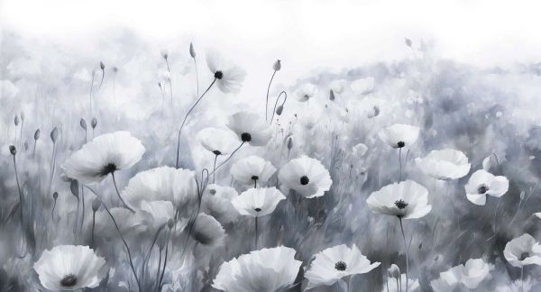 Witte klaprozen die zich zachtjes aftekenen tegen een koele, pastelblauwe achtergrond. De subtiele penseelstreken en lichte kleurverlopen geven een frisse, almost luchtige uitstraling, perfect voor een kalm en helder interieur.