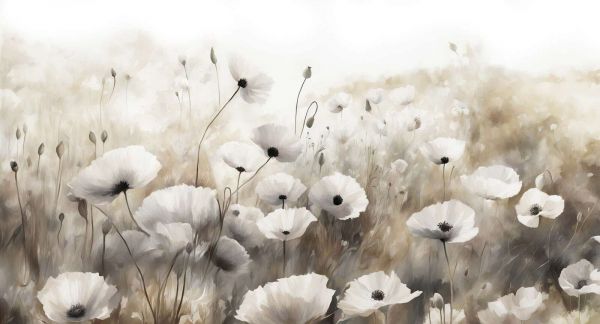Dit ingetogen en elegante ontwerp toont witte klaprozen die bijna opgaan in de zachte crèmetinten van de achtergrond. De verfijnde penseelstreken en subtiele schakeringen van beige en ivoor geven een rustige, bijna minimalistische sfeer. De bloemen zweven als het ware op een wolk van zachtheid, waardoor het geheel een lichte, harmonieuze uitstraling krijgt.