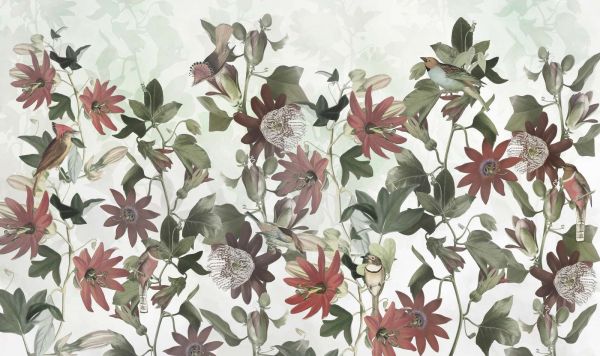 Een betoverend ontwerp waarin levendige vogels zich mengen tussen uitbundige passiebloemen en weelderig groen. Elk detail, van de delicate veren tot de sierlijke bloesems, brengt een speelse maar verfijnde energie in het ontwerp. De zachte kleurschakeringen creëren een harmonieuze achtergrond die zowel natuurlijk als elegant oogt.