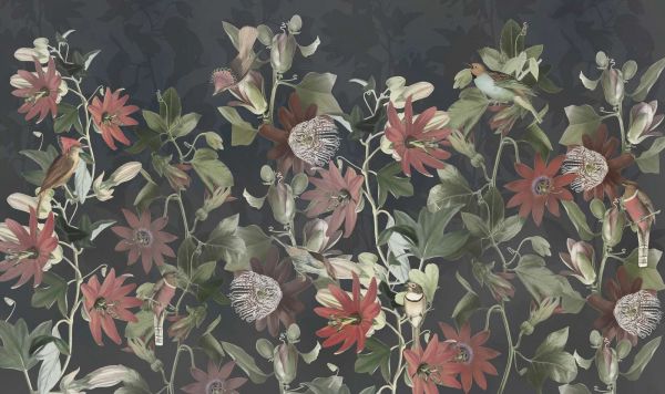 Een betoverend ontwerp waarin levendige vogels zich mengen tussen uitbundige passiebloemen en weelderig groen. Elk detail, van de delicate veren tot de sierlijke bloesems, brengt een speelse maar verfijnde energie in het ontwerp. De zachte kleurschakeringen creëren een harmonieuze achtergrond die zowel natuurlijk als elegant oogt.