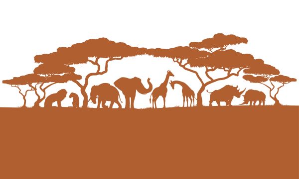 Roestkleurige achtergrond wat overloopt naar een silhouette landschap met safaridieren.